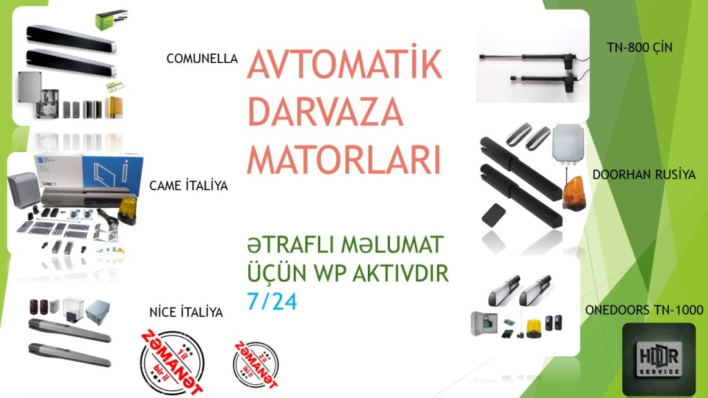 HOOR GROUP MMC Hissə hissə 18 aylıq ödəniş mumkundur.. Xarakteristika: 1..Ceki-11kq 2..Techizat gerginliyi 220-240/50 v/hz 3..Intensivlik-50% 4..Qorunma reytinqi-IP54 5..Guc-3000N 6..Isleme temperaturu -40.....+50 C 7..Kondensator-10mf 8..Komplekte daxildir: 9..2 eded mator (qol) 10..Photosel (sensor) 11..Isiqlandirmasi 12..Plata 13..2 eded pult Daha etrafli melumat ucun zenq edin whatsapp aktivdir açar sözlər: avtomatik qapı qolu, darvaza matoru, rusiya darvaza qolu, avtomatik darvaza mühərriki, came, italiya qapı qolu, nice, alutech, darvaza mühərriki, qapı qolu satışı, doorhan avtomatik qapı matoru, doorhan darvaza matoru, qapı qolu,avtomatik jaluz qapilari yigilmasi, pult sistemi,pultla acilib baglanan qapi, pultlu qapı