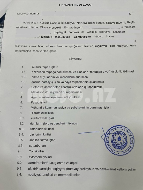 2023 CU İLDƏ QEYDİYYATDAN KECMİS, TİKİNTİ- QURASDİRMA İSLƏRİNƏ LİSENZİYASİ OLAN HUQUQİ ŞƏXS SATİLİR. ŞİRKƏTİN DOVRİYYESİ OLMAYİB BORCU YOXDUR. HESABİ DA ACİLMİSDİR. TAM FƏALİYYƏTƏ HAZİRDİR. CİDDİ SEXSLER ƏLAQƏ SAXLASİN. ZENG VE YA WhatsAPP..